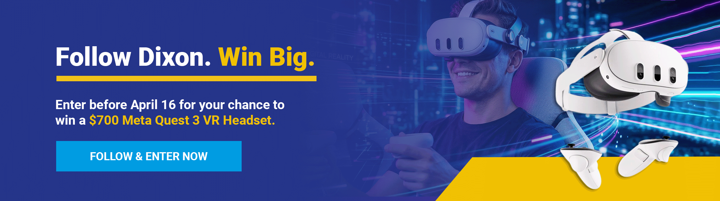 *Prize: The prize will consist of one (1) Meta Quest 3 VR Headset (512 GB), which prize is non-transferrable and non-refundable and must be accepted as awarded in “as in, where is, with all faults” conditions. There are no warranties, expressed or implied on the prize. Dixon is not responsible for local, provincial, federal or any taxes or cost to make said prize legal in Canada, all shipping costs, transportation and insurance has to be covered by the winner and Dixon is not responsible for any damage or theft of item after 48 hours of the winner being notified. Dixon will not be responsible for repair or any damage to the prize.